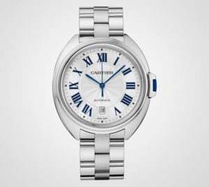 För att börja arbeta med Cartier valde Sofia Coppola Clé de Cartier-klockan för sig själv. Hans design passar hennes enkla stil: formgivare kombinerar skickligt tradition och modernitet i den. Det stora vitguldfodralet (40 mm i diameter) har en strömlinjeformad form, är något upphöjd från profilen och ”lindar” armbandet med satinmitten och polerade ytterlänkar. Clé, eller nyckeln, har sitt namn till spetsens form, som inte är rund, som i de flesta klockor, men avlånga. På detta sätt hänvisade designers till klocktraditioner, eftersom den långsträckta spetsen är en modern tolkning av tangenterna som klockorna en gång var lindade med. Det är dekorerat med blått safir klockor kopior och dess form passar perfekt in i kuvertets utseende. Moderniteten har också nått husets insida, där en ny mekanism med automatiska lindningsarbeten (kaliber 1847 MC) skapades i sin egen tillverkning. I sin tur visar ratten traditionella blå händer och romerska siffror – element associerade med Cartier-klockor.
